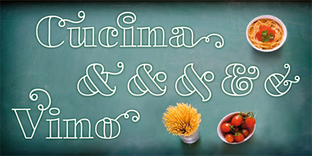 It also comes with more than 600 glyphs, which are alternate characters, swashes and ligatures. Below, for example, are some of its curlicues and five different ampersands . . .