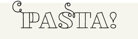 I wanted to point out another handy feature in InDesign’s Glyphs palette, for those who aren’t accustomed to using it. In the “Show” drop-down menu within the palette, there are many options to help you narrow down the number of glyphs displayed (which can be really helpful with a font such as LiebeDoni, with so many glyphs to sort through). I often utilize the “Alternates for Selection” option: Using “Pasta” as an example, if you highlight the “P” with “Alternates for Selection” active, the glyphs palette will show only the options for the letter P, so you don’t have to scroll and scan through all 600 characters.